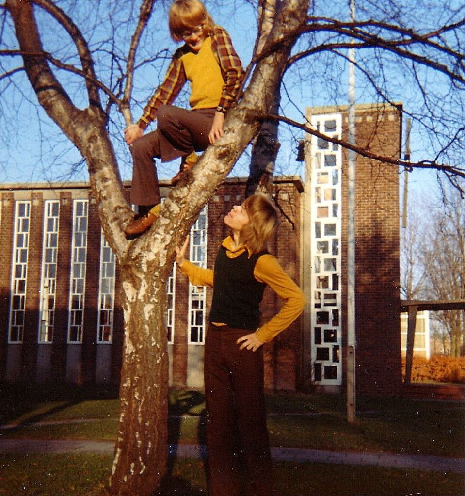 Mijn broertje in de boom, ik er naast. De berk stond tussen de kerk en de kosterswoning.