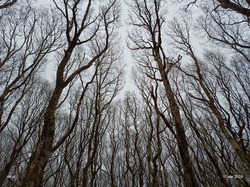 Ik kwam door een mooi bos van grillige eiken. Dat zijn op deze grond langzaam groeiende bomen. In het verleden werden ze hier vlak boven de grond afgezaagd. De stam liep dan opnieuw uit tot een nieuwe boom totdat de zaag weer langskwam. De bomen lijken op die manier jong maar kunnen oud zijn.